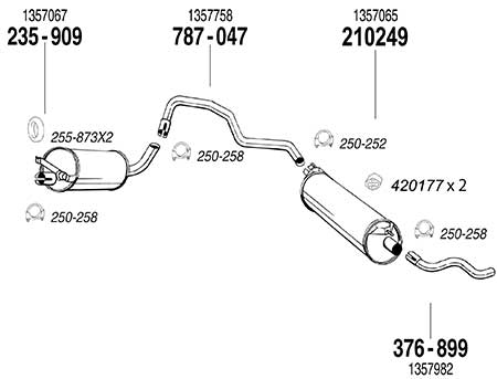 240 GL セダン/ワゴン (中間パイプが後車軸の上を通る車) | 年式:85-93 | 型式:AB230 | エンジン:2.3-8V 84Kw | 備考:中間パイプが後車軸の上を通る車用。現車確認してください。 (パイプが車軸の下を通る車は下記) |